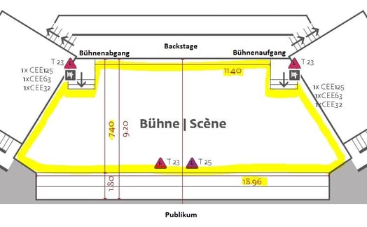 | 12. | Lors des éliminatoires bernois, la surface de la scène sera de 11.49-18.96 mètres sur 7.40 mètres (voir ci-dessous). |